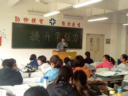 首先,各班心理委员为大家讲解了两个概念:什么是幸福?什么是幸福力?之后同学们分小组讨论了“你身边的幸福”。同学们一起分享了个人的一些提升幸福力的方法或感悟,其中,12级汉本班的沈佳慧同学说:提升幸福力—向外求,不吝惜汗水和付出,注重提高自己的物质生活水平;向内求,注重修性和练心,保持宁静豁达的心态。12新闻班的苏迪同学说:提升幸福力就是要让心中充满爱,每天保持爱的心态。多做有意义的事。12文秘班的宋雯静同学说:提升幸福力就是要为自己制定人生目标并为之努力,常葆希望。