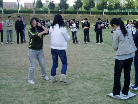 在6人绑腿快跑中,不仅考验选手们的速度更考验选手之间配合的默契程度,通过三轮的角逐,08级法本一班、09级法本一班和09级法本三班以优秀的成绩、默契的表现脱颖而出!接下来的吹气球比赛,每班选派6名同学参加了该项目的比赛,只见每组的6名同学分工合作,他们一人负责吹气球、两人负责拿气球、一人负责砸气球、另外两人负责抬那位砸气球的同伴。比赛在气球的爆破声和同学们的叫好声中结束!在第三轮的比赛中,参赛选手以自己脚下的报纸为界限,每人拿一足球掷向对方,砸到对方膝盖以下者为胜,被砸者要和同伴共站在一张报纸之上。比赛中,同学们你投我躲,欢声一片。而在第四轮蒙眼过河的比赛中,同学们的表现更是令在场的同学们喝彩声不断!