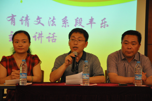大会在奏唱中国共青团团歌中拉开序幕。首先,段丰乐主任发表了重要讲话。段主任对本年度系团学工作给予极大地肯定,他讲到本届团委员工会继承了文法系团委的优良传统,积极配合院系党团组织,积极组织系团学干部完成各项工作并取得了优异成绩,赢得了老师与同学们的一致好评。接着段主任对员工干部提出几点希望,希望大家不断提高自身素质,处理好学习与工作的关系,充分认识到自己的重要性,起到带头模范作用。希望继续留任的团学干部们保持优良的工作作风,以饱满的精神状态投入到以后的工作中。希望即将光荣退部的团学干部们能够继续发扬系团委员工会的优良传统,在以后的工作与学习中取得骄人的成绩。