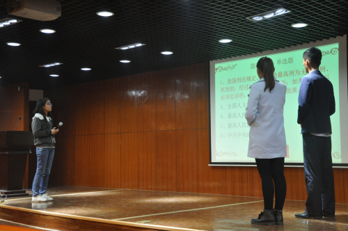 比赛正式开始,参赛选手依次上台作答。选手们个个充满自信,对答如流,显示了选手赛前充分的准备和扎实的法律基础知识,赢得了观众的阵阵掌声。在前七位选手回答完毕后,开始进行有奖竞答环节,该环节把此次活动的气氛推向高潮,场下同学们踊跃参与,积极竞答。