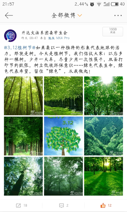 本次3.12植树节网络宣传活动的举办不仅增强了同学们保护环保的意识,点燃了同学们绿色低碳的热情,进一步把这种环保理念传递给身边的人,加大了对绿色环保主题的宣传力度,同时也促进了环境的美化,净化了心灵,更把美化环境、从我做起的观念深深植入同学们的心中。(供稿:文学中心 陈佳恒)