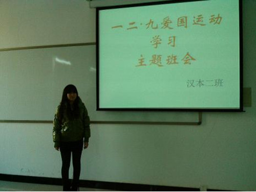 为激发老员工爱国主义精神,增强其责任感、使命感。在纪念一二·九运动77周年之际,文法系2011级团总支在刘玉梅老师的组织带领下,于12月7日,在商管楼各个班级主教室分别开展纪念一二·九团日活动。