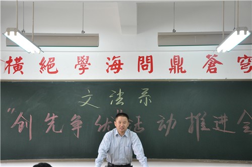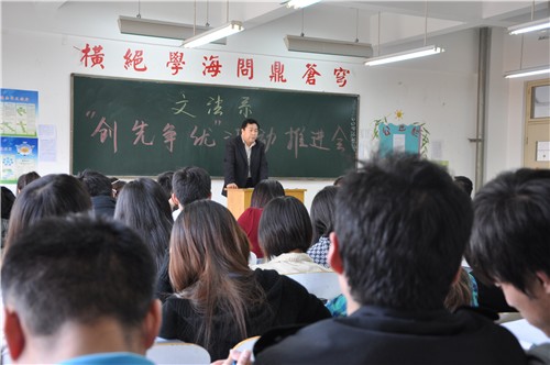 10月12日下午3:30,文法系党总支在商管楼401召开“创先争优”活动推进会。会议由系党总支宣传委员郑玲玲同志主持,文法系党总支书记张朝阳同志、系党总支副书记杨明志同志、系党总支委员、教工党支部书记赵严俊同志及全体师生党员参加了本次会议。