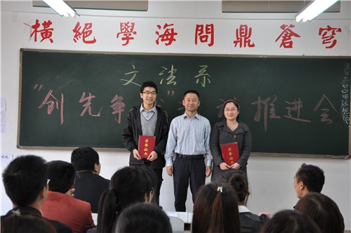 会议第一项是为刚刚结束的“创先争优”活动征文比赛中获奖的师生进行颁奖。张朝阳书记、杨明志副书记、赵严俊老师分别为获得一等奖、二等奖和三等奖的师生颁奖并合影留念。自9月27日文法系党总支部署“创先争优”活动以来,我系师生各党支部高度重视,积极参与,在不到半个月的时间内共征集参赛作品289篇,展示了我系师生创先争优、积极上进的精神风貌。郑玲玲老师对在此次创先争优主题征文活动中获奖的师生表示祝贺,并号召广大的党员以他们为榜样,向他们学习。