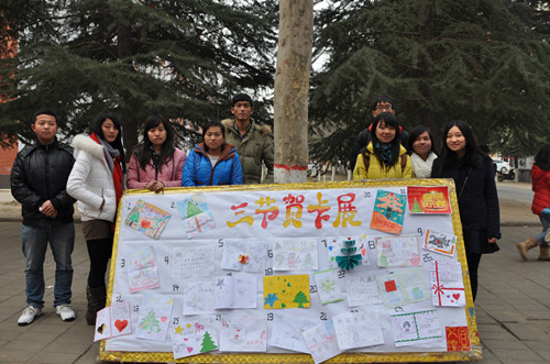 三节贺卡大赛一共分为三个环节。在12月12日至18日期间,是活动的作品征集环节。因为三节即将来临,而参加的同学也能够借此机会给自己的老师或者同学送去祝福,所以一时间各种各样的作品纷沓而至。活动的作品投票环节在18日中午12点开始,同学们辛苦创作的作品铺满了整张展板,形态各异。文法系行政秘书兼团委书记郑玲玲老师也亲临现场,给优秀的作品投了宝贵的一票,并和同学们一起合影。最后经过唱票,获得一等奖的是杨玉叶,获得二等奖的是张风娟、崔锦锦,获得三等奖的是刘芳、陈莹。而此次活动的最后一个环节在12月19日中午进行,由获奖者拿着自己的作品,给老师们送去节日的祝贺,来表达自己的心意。老师们看着成长得越来越懂事的同学们,也欣慰地露出自己的微笑,并希望同学们在以后的生活中越来越好。