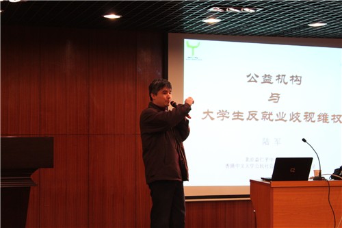 此次报告会,陆军先生先以中国“乙肝第一案”为切入点,分析了乙肝患者在就业中受歧视的问题以及乙肝患者反歧视开展的各种活动。其中一张图片展示一名乙肝患者用形象的肢体言语向大家表现了乙肝患者就业的重重困难和他们渴望拥有一份工作的强烈愿望,令在场的同学们动容深思。