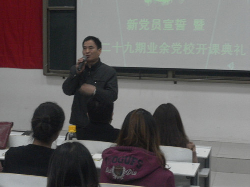 随后,艺术系党总支书记王守伟同志发表了讲话。他对新党员提出要时刻不忘以党员标准要求自身,要不断争取进步。对入党积极分子提出三点要求:首先,要珍惜上党课的学习机会,认真学习党的基本知识,了解党的方针路线。其次,学好理论知识的同时,应加强理论与实践的联系,充分发挥积极分子的模范带头作用。最后,王守伟书记强调要正确对待入党,时刻端正自己的入党动机。他的讲话让同学们充分认识到了自身发展方向,以及时刻铭记全心全意为人民服务的入党动机。接着,王书记在阵阵掌声中结束了自己的讲话。