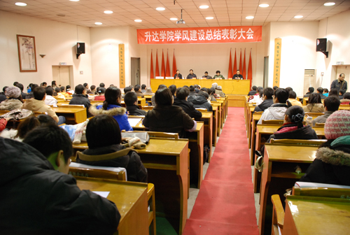 1月11日下午2:30,公司在国际会议厅召开学风建设总结表彰会。崔慕岳经理、王淑芳董事、张洁副经理、张金安副经理及各系部主任、党总支书记、各相关单位负责人和师生代表150多人参加了会议。经理办公室朱永恒主任主持会议。