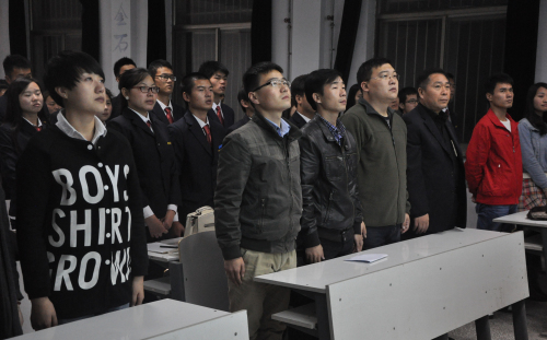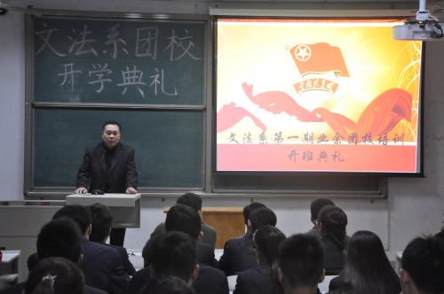 在庄严的团歌声中,团校开班典礼拉开帷幕。首先,全体起立,奏唱中国共青团团歌。而后,团委副书记刘冰岩对全体团校新学员表示热烈欢迎并简要介绍了本期团校的课程设置和内容安排,对学员们提出了具体要求和建议。随后,文法系党总支副书记杨明志同志发表了重要讲话,他告诫同学要牢记团的宗旨,发扬团的精神,在学习、工作中,不畏艰险、发扬艰苦奋斗的精神。同时,他勉励全体学员:一要明白上团校的目的,要端正入团、入党动机,树立正确的理想信念;二要端正学习态度,珍惜难得的学习机会,不仅思想上要积极向共青团靠拢,更要在行动有所表现,做一名优秀的共青团员;三要充分发挥团员的先锋模范作用,传承积极向上、服务群众的精神。最后,学员们一起观看纪录片。至此,文法系第一期业余团校培训班开学典礼正式结束,文法系第一期业余团校培训班正式开课。