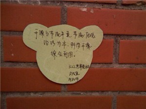 此次活动前向全系同学征集了优秀的节水标语。经过层层筛选,共有50条标语脱颖而出。“一滴珍藏,源远流长”、“我用生命的全部呵护你,只求在你手心的刹那温暖”、“此时一捧水,彼时生命线”等等,一条条短小精炼的标语表达了大家的节水理念。之后,系团委员工会成员将这些标语以卡片的形式制作成提醒大家节约用水的“温馨小贴士”在校园内展出。