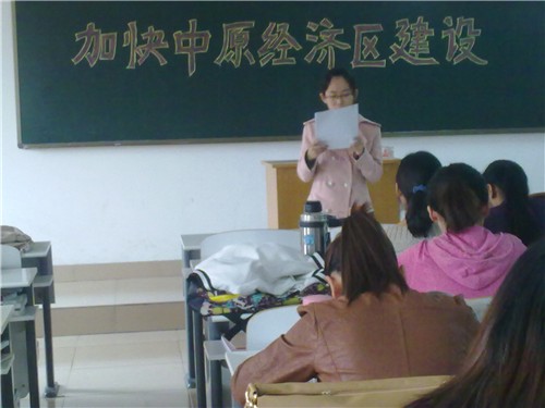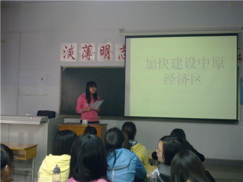 座谈会上,08级汉本一班张志顺说:我为自己是一个中原人感到骄傲和自豪,更为国家支持中原崛起、加快建设中原经济区采取切实措施感到高兴和欣慰。中原地区是中华民族和华夏文明的重要发源地,我们河南省更是我国的人口大省、粮食大省和农业生产大省,是祖国的“粮仓”,为解决全国各地老百姓的温饱问题发挥着重要作用。如果中原地区发展滞后,或者粮食出现欠收情况,势必会影响整个国家的稳定与发展。所以,加快建设中原经济区是保障国家粮食安全的需要,也是加快新型工业化、城镇化进程的需要,更是实现区域协调发展、全面建设小康社会的重大举措。10级汉本一班王利平发言说,作为河南老员工,尤其是汉语言文学专业的我们应该努力弘扬中华优秀传统文化,致力打造昂扬向上的中原人文精神,全面提高自身素质,为中原经济区建设提供强大精神动力和智力支持,使我们由人口资源大省转变为人力资源强省。