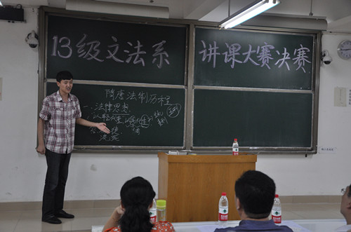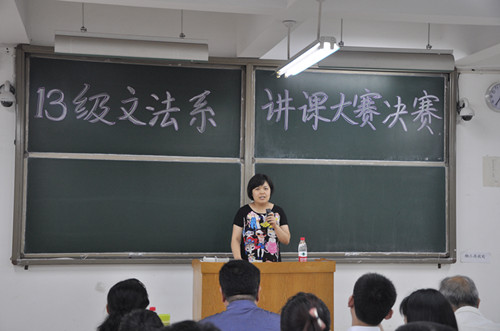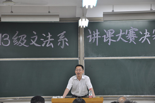 当世界球迷为世界杯精彩的比赛激动振奋时,文法系讲课大赛这场好球也踢得格外漂亮。经过为期一个月的选拔,从初赛到复赛,文法系2013级讲课大赛决赛终于开赛了。6月19日下午2:30,2013级文法系讲课大赛在商管楼218隆重举行。文法系主任段丰乐,文法系党总支副书记杨明志,文法系教学秘书曹丹丹,行政秘书郑玲玲出席本次活动。另外,特邀乐铄教授和宋尔康教授以及文法系各专业课老师担任大赛评委。