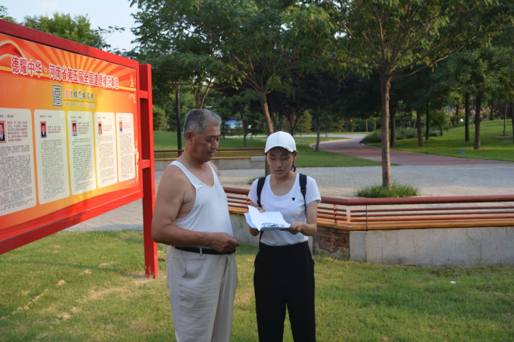7月20日,“最美郑州”环保实践团志愿者来到郑州侯寨乡新社区开展环境保护实践宣讲活动。到达目的地后,按照提前的分配,队员们迅速分组,前往社区居民聚集的地方宣讲环保知识,同时对社区居民进行简短采访,了解居民对社区环境卫生状况和其他环境污染的看法与意见。