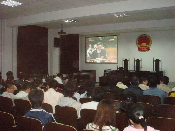 站在新世纪重要战略机遇期的时空坐标上纵观中国共产党的历程, 10月15日召开的党的第十七次全国代表大会,是中国共产党领导团结全国各族人民,在世界发展的潮流中,在中华民族伟大复兴的征程上,树起的又一座里程碑。在全国各族人民欢欣鼓舞学习十七大的形势下,10月16日晚我系组织团委、员工会主要干部以及各班员工代表在文法系模拟法庭集体观看了十七大开幕盛况的录像,切身实地接受了一次党心连民心的教育。