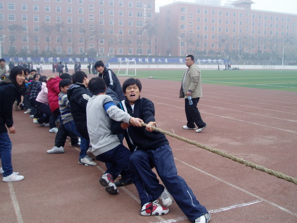 12月10日下午2:00,由文法学系员工会办公室主办的09级新生拔河比赛在升达体育场如期举行。09级新生四个班进行了一场力量与技巧的较量。当天下午,09级辅导员晏玲玲老师到场为同学们加油助威,系篮球队队长程兴宇同学担任本次比赛的裁判。
