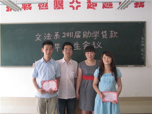 6月13日下午两点,文法学系在商管楼121教室召开2011届毕业生助学贷款确认会议,会议主要讨论了毕业生诚信还贷以及相关注意事项。会议由文法学系资助专员郝艳海老师主持,毕业班辅导员刘玉梅老师和全体2011届助学贷款毕业生参加了本次会议。