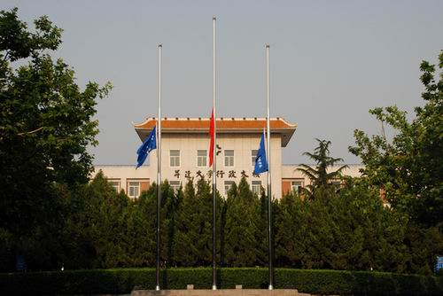 早上6:30,国歌声响起,国旗像往常一样缓缓升起,数百位师生凝望国旗,歌声低沉而又坚定有力。当升到顶端的国旗又缓缓降下的那一刻,每个人都为我们的国家遭此大灾而感到深深的悲恸,为远在千里之外的灾区人民默默祈祷。