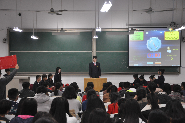 一言之辩重于九鼎之宝,三寸之舌强于百万雄师。为了培养同学们的逻辑思维能力、语言表达能力、临场应变能力,选拔优秀的辩论人才,经过一轮轮积分赛的比拼,11月10日晚18点30分,文法系学艺部辩论队承办的新生辩论赛决赛在时金楼107室隆重开幕。出席本次活动的嘉宾有文法系团委书记郑玲玲老师,文法系团委常务副书记彭凯老师,文法系15级团总书记张明奇老师,14级院辩论队队长王新鹏,14级院辩论队教练王君锋及院辩论队教练、文法系第14届辩论队队长省赞及兄弟系辩论队负责人。文法系部分同学到场观看了本次比赛。