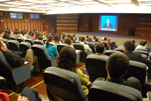 3月18日上午,365VIP英国上市官网党委组织广大党员干部师生在外语楼一楼报告厅集中收听收看温家宝总理答记者问。崔慕岳经理、戎庭银常务副书记、张平之副经理、张洁副经理出席集中观看活动,公司一级主管,各系党总支书记、副书记、思想政治理论课教师和部分师生代表等200余人参加了集中观看。