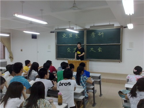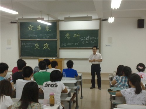 阵阵的微风,送来花的芬芳。07级学子在文法学系领导老师的精心栽培下,通过自身的不懈努力,取得了优异的考研考证成绩。为了激励在校生的学习热情,文法学系于6月15日晚6时30分在商管楼218教室举办了法学专业考研交流会,会议邀请系段丰乐主任担任现场嘉宾,交流会由09级团总支书记郭青梅老师主持召开。