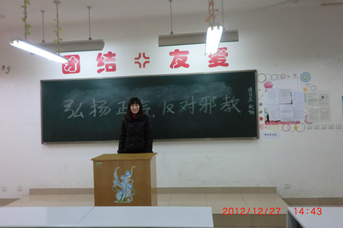 近日,“全能教”等邪教利用世界末日等传言鼓动他人违法乱纪,在社会上引起极其恶劣的影响。为保护员工安全,提高防范意识,使其远离邪教。12月27日下午,在院系领导的相关指示下,文法系11级团总支在刘玉梅老师的组织下分别开展了“相信科学,抵制邪教”系列的主题班会。
