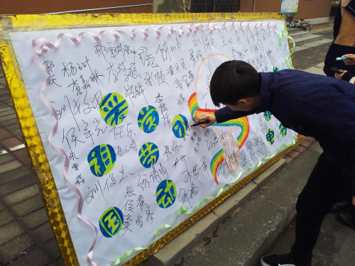 放学之际,文法系团委组织部成员在金控中心门口开始了“爱学习、爱劳动、爱祖国”和“节水、节粮、节电”的“三爱三节”宣传活动。通过对“三爱”内容的讲解,让大家对于践行社会主义核心价值观,树立正确的世界观、人生观、价值观有了更深刻的理解。通过对“三节”内容的讲解,使大家明白日常小事也能作出巨大贡献,使大家认识到节约的重要性。宣传活动过后,组织办还邀请过往同学在展板上进行签名留言,引导大家积极践行“三爱三节”的要求。整个活动场面热烈,路过的老师们也积极参与。