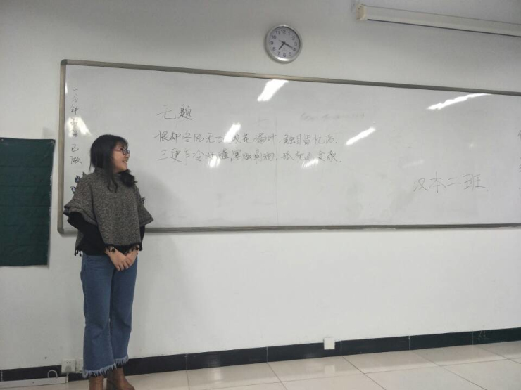 在辅导员和汉语言文学班班长及各班委的组织下,活动现场同学们热情高涨,气氛活跃。活动一共有三个环节。第一环节,读诗、分享。同学们分享前期摘抄的最喜爱的诗文,谈自己的心得体会,在此环节,有几位同学们大胆分享自己创作的诗词,获得大家的一致好评。第二环节,你说我猜。选手们踊跃参与,你说我猜,乐趣不断,在轻松愉悦的环境下,大家不仅加深了对诗词内容的了解,而且激发了同学们对诗词阅读、创作的热情。最后,由17汉本班学艺股长魏雅美对活动进行总结。活动期间,同学们在学习诗词过程中深刻领会到语言、文字和诗词的魅力。