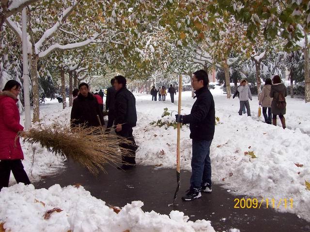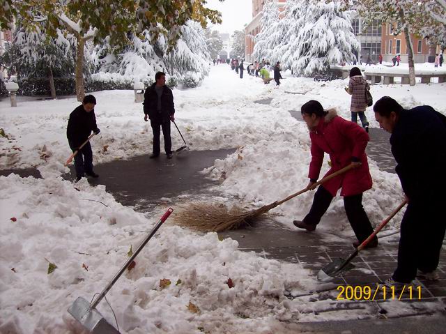 经过大家的共同努力,一个小时后一条从商管楼通往教学1、2号楼、外语楼和资讯楼的路就清理出来了,前往这几栋教学楼的师生再也不必担心满是积雪的路面了。(文法系 供稿)