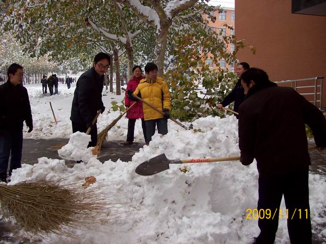 昨晚,一场瑞雪降临,在感叹这银装素裹的洁白世界的同时,也让全院的师生员工感受到出行的极大不便。11月12日8时许,在接到公司关于扫除校园积雪的通知后,文法学系没有教学任务的同仁和商管楼的管理员老师在段丰乐主任的带领下,立即投入到热火朝天的除雪工作中。