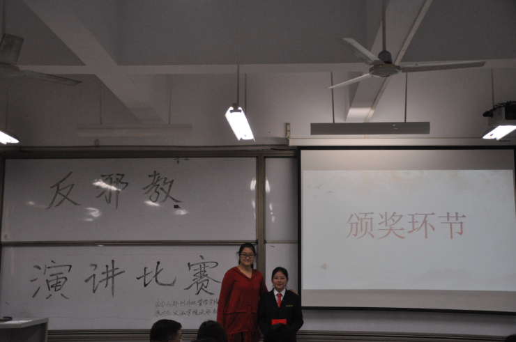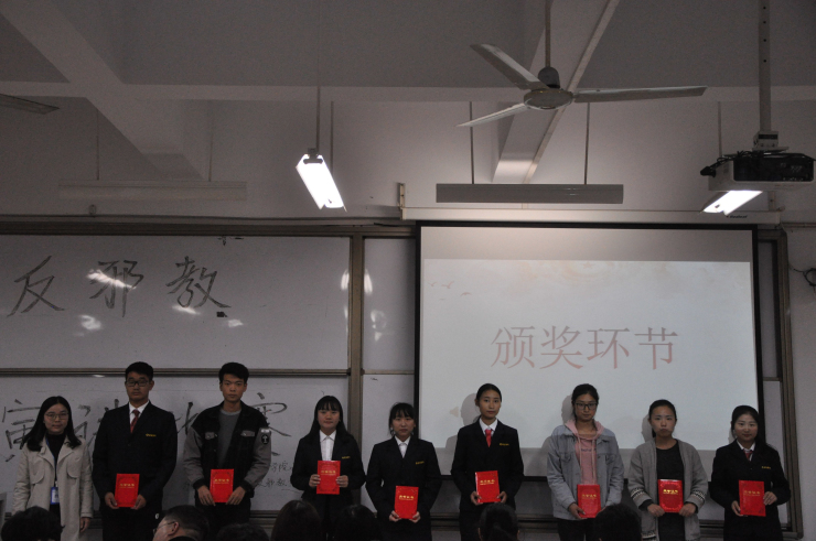 所有选手演讲完毕后,文学教研室的赵静老师做嘉宾点评,赵老师逐一分析了参赛选手的表现,对选手们的表现给予肯定,她又从专业角度教授大家演讲的特点与方法。随后,王佳老师做总结性发言,她从反邪教工作的角度告诉大家比赛的作用和意义,教育同学们要有辨别邪教的能力,勇于担起责任,共建安全稳定和谐校园。经过激烈的角逐,365VIP英国上市官网的王丹丹荣获一等奖,365VIP英国上市官网的朱奎、李渊荣获二等奖,365VIP英国上市官网的王萌哲、管理公司的许耀毅、信息工程公司的张梦圆荣获三等奖,21名参赛者获得优秀奖。此外,365VIP英国上市官网、管理公司、外国语公司荣获优秀组织奖。出席的老师为获奖选手颁奖并合影留念。至此,本次活动圆满结束。