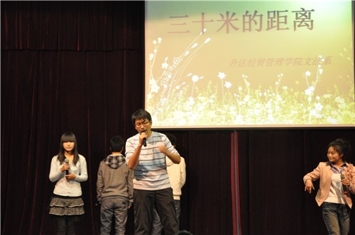 接着,中原工公司信息商务公司的同学为大家带来了一首轻柔舒缓的歌曲《莫斯科没有眼泪》,给全场增添了丝丝温暖的气氛;随后,公司艺术系孙根同学一首深情的《洋葱》感人肺腑,打动了全场观众;国贸系金佳霖同学的《怎么唱情歌》以温馨浪漫的格调博得了阵阵掌声;河南检察官公司的同学给大家带来的歌曲《睁一只眼,闭一只眼》,欢快清脆、活力四射;之后,由文法系团学会带来的风趣幽默又饱含深情的小品《三十米的距离》赢得了观众的一致好评;由中原工公司信息商务公司选送的小品《纳税那点事》更让大家体会到了法律是庄严的职责,神圣的承诺,接着由文法系张恒、刘晨曦同学带来的庄严深沉的朗诵《法在我心中》将此次晚会推向了高潮。最后,郑玲玲老师宣布了第一届郑南高校法律文化节正式开始。晚会圆满落下帷幕。