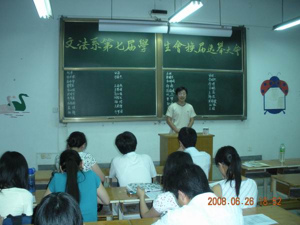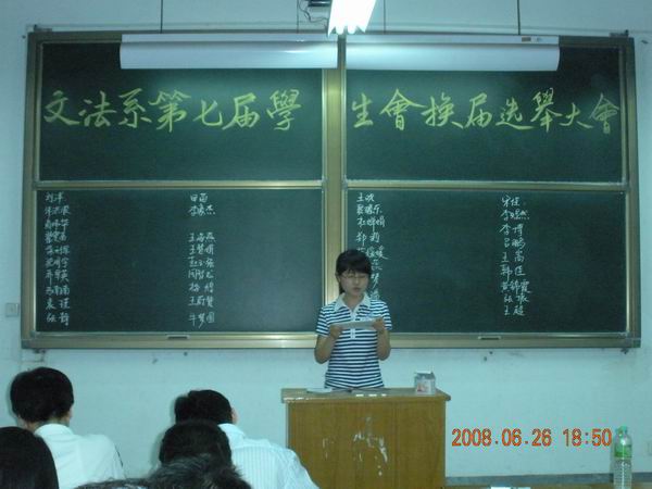 6月26日晚,在综合楼128教室举行了文法学系第七届员工会换届选举大会。出席此次大会的有文法学系团委书记韦杨建老师、团委副书记郝艳海老师、辅导员刘玉梅老师以及系团学主要员工干部和各班员工代表。大会由系员工会主席李超同学主持。