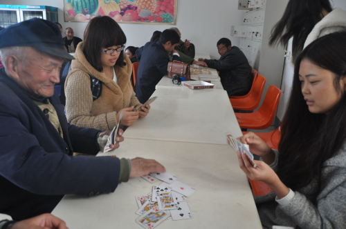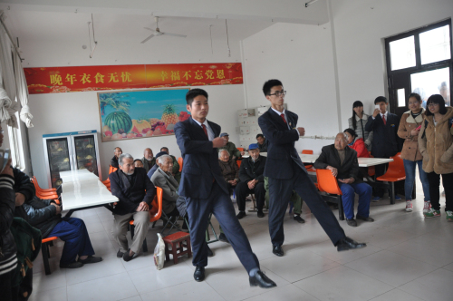 冒着菲菲的细雨,踏着泥泞的小路,公司文法系志愿者们打着彩旗,带着爱心步行前往敬老院。志愿者一到敬老院,就受到了老人们的热烈欢迎。志愿者们先简单询问了老人们的身体和生活状况。接着,他们纷纷展现了自己为老人们准备的精彩节目:优美动听的歌曲、震撼人心的武术以及雄健有力的正步赢得了老人们的阵阵掌声。其中豫剧演唱《刘大哥讲话理太偏》和黄梅戏表达了对老人们的亲切问候与满满祝福,更引发了老人们的无限感慨,让老人们热泪盈眶;歌曲《国家》也让老人们再次感受到了温暖人心的爱。最令老人们感到温暖的是在节目结束之后,志愿者们与老人们亲切的交谈与互动:有的老人向同学们讲述自己坎坷复杂的人生经历,给同学们传授自己的生活经验;有的老人和同学们进行象棋比赛,并向同学们传授自己的技艺;有的老人们甚至拿出自己的乐器,向同学们展示自己的绝技,这些让所有人都感到发自内心的开心,整个场面温馨感人,其乐融融。最后,在黄昏时分,老人们依依不舍地与同学们告别,并目送同学们离开了敬老院。