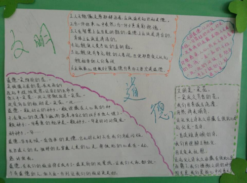 班会之后,文学专业开展了一系列的文明礼貌活动。为了营造“文明礼貌月”浓厚的校园氛围,同学们一起制作了“文明礼貌月”展板,并在“文明礼貌我能行”专栏里签了名字,表达了自己争做文明礼貌标兵的决心;有的同学在路上发现了被风刮倒的展板,赶紧扶了起来,并抚正了褶皱的展画。有的同学发现了校园里摆放不整齐的自行车,几个人一起对它们进行了“美化”,整理后的校园看起来整洁多了;还有的同学在老师授课之后到办公室为老师整理资料,体现了同学们对老师喜爱和尊敬;最后,文学专业同学在班里用制作宣传海报、文明标语、手抄报等形式提醒大家讲文明,懂礼貌。