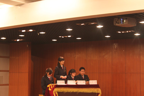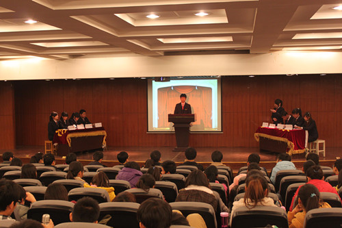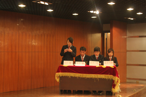 12月11日晚,文法系12级新生辩论赛决赛在外语楼多功能报告厅举行。本次大赛邀请到的嘉宾有文法系团委常务副书记郝艳海老师、文法系12级团总支书记彭凯老师、院学艺部部长王珂、营销系辩论队队长刘哲、企管系辩论队副队长韩伟康、资讯系辩论队队长彭国栋、会计系辩论队副队长梁冠毅、外语系辩论队副队长李朝霞、国贸系辩论队队长王楠。担任本次大赛评委的是院辩论队队长刘英迪、院辩论队副队长张恒、文法系模拟法庭庭长石祥帅、文法系团委副书记张园园和文法系员工会主席黄敏。