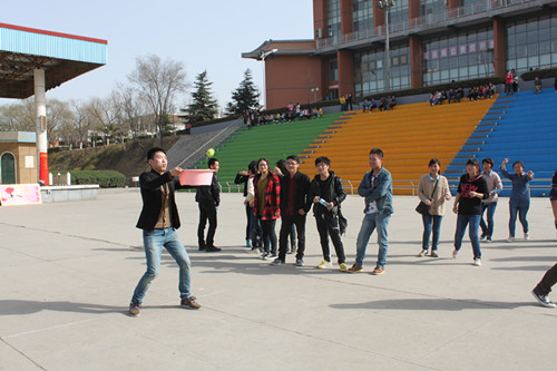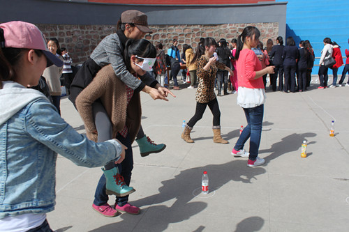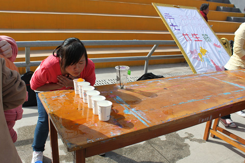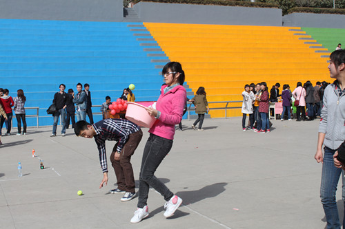 此次活动主要由“盲人指路”、“投网球”、“吹球”、“猜成语”四个游戏环节组成。通过一轮游戏可以获得一张票,获得三张票的参与者可以到主席台抽取奖品。在“盲人指路”的游戏中,“盲人”需要在同伴的指引和提示下走完全程,参与者默契的配合使现场观众叫好连连;“猜成语”游戏将活动推向高潮,此游戏中,队友通过肢体语言和语言提示使同伴猜出成语,游戏过程中队员某些滑稽的动作和幽默的语言引得观看者捧腹大笑。一项项充满趣味性与挑战性的比赛项目,使比赛现场喝彩连连,欢笑不断。