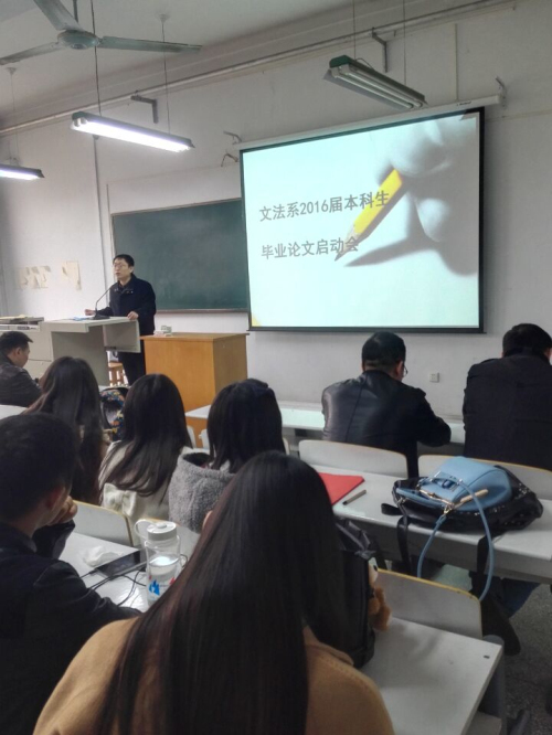 11月12日下午,文法系2012级毕业生分别在商管楼506教室和综合楼325教室组织召开了毕业论文启动会。系主任段丰乐老师、教学秘书曹丹丹老师、汉语言文学教研室主任乐铄教授、法学教研室主任徐静副教授以及我系全体专职教师均到场参加会议,会议分别由乐铄教授和徐静副教授主持。