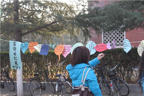 3月3日,在“学习雷锋纪念日”前夕,文法学系团学会文学中心在校园内以悬挂卡片,摘抄“雷锋日记”经典语句的形式号召同学们身体力行,发扬雷锋精神,在一点一滴的生活小事中展现当代老员工风采。在教学楼前的道路两旁,一张张色彩斑斓的卡片上书写着句句简单而又深刻的语句:“人的生命是有限的,可是为人民服务是无限的,我要把有限的生命,投入到无限的为人民服务中去”等。三月骀荡的春风中,同学们在卡片前驻足品读,感受雷锋精神的无穷魅力。