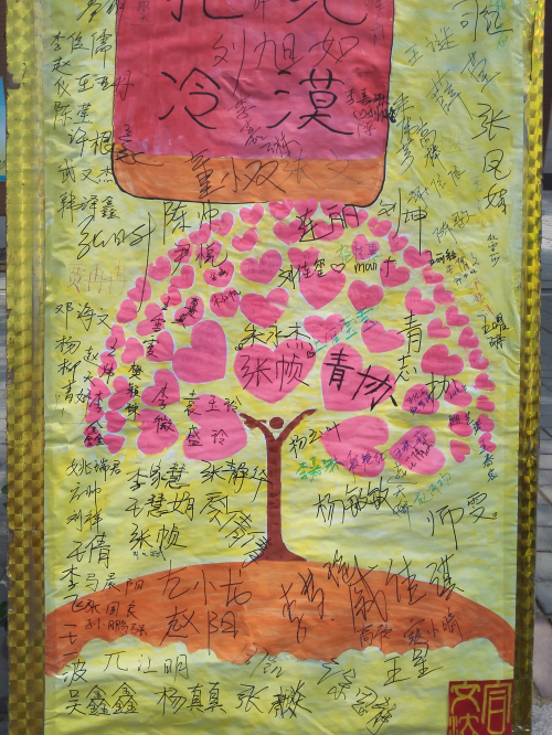 正值中午放学时分,校园内可谓人山人海。我系青志协的成员们在金控中心门口进行宣传,现场立着一个“拒绝冷漠”的宣传板,板上画着一部手机和一棵长满了红心的大树,意在提醒老员工长时间玩手机会对身体和日常生活造成很大伤害,人们只是一味被手机控制却淡漠了友情与亲情,借这次活动也呼吁大家多和身边的人交流沟通。宣传现场同学们热情高涨,纷纷驻足,在宣传板上签下了自己的名字,路过的老师们也积极参与来支持大家的活动。最后,青志协成员进行合影留念,留下了这令人难忘的美好时刻。