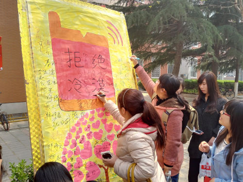 随着智能手机的广泛使用,越来越多的人都将闲暇时间交给手机而忽略了与身边亲人、朋友的交流,为了加强同学们之间的交流,让心与心的距离更近,4月9日12点10分,文法系青志协在公司商管楼金控中心门口举办了关爱心灵——拒绝冷漠的签名活动。