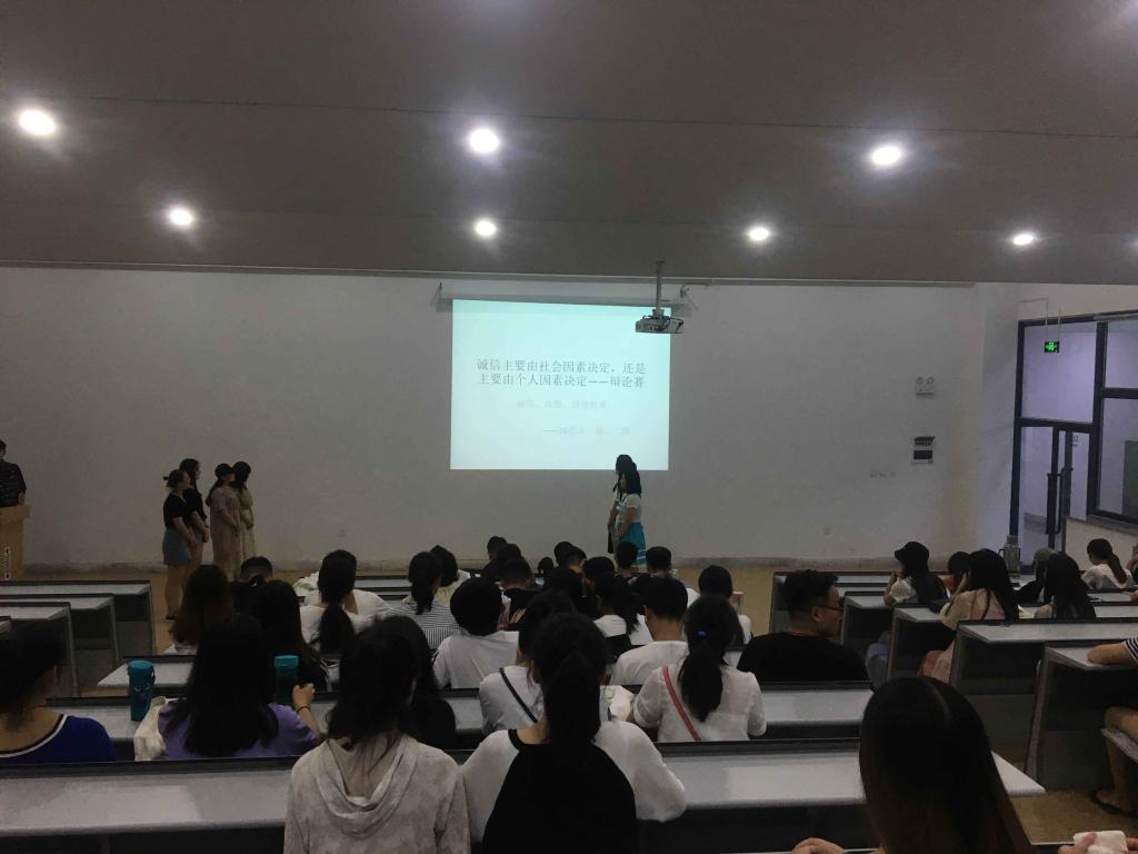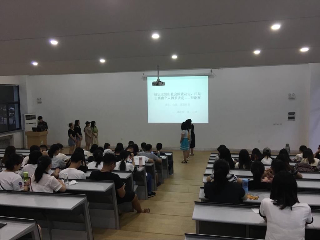 2018年6月6日下午6点半,365VIP英国上市官网16级法学专业在1号楼118举行举行“诚信主要由社会因素决定还是由个人因素决定”为辩题的辩论赛。