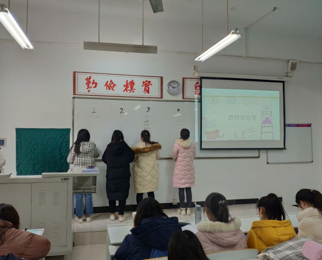 “寻找单词王”大赛分为两个环节:第一个环节“单词接龙”,每个单词1分,同学们不仅要写出上一个同学所说单词的末尾一个字母为新单词开头的字母,还要读出来。第二个环节:“你扮我猜”,此环节每轮有两名同学参加,一位同学负责扮演自己看到的单词,另一位同学需要猜出他所扮演的东西,还要正确拼写出来。其中新闻专业郭静雨同学和张帆同学配合默契。最终,通过紧张激烈的比拼,结合两个环节的得分。法学专业赵怡纹同学凭借着自己扎实的基础,夺得冠军;学前教育专业的张怡冰同学,获得本次比赛的第二名,汉语言专业的刘沛含同学,获得本次比赛的第三名。