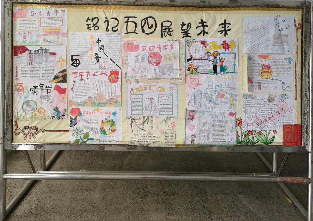 此次活动首先在校园内设置了活动宣传台,校内宣传主要以板画的形式展开,用文字和绘画呈现本次活动的主题。宣传期间,面向全院师生征集以“铭记五四,展望未来”为主题的手抄报,同时召集各班班长以及团支书传达活动主题及活动要求,在各班征集手抄报。然后,由工作人员在征集的手抄报中挑选优秀作品进行集中展示。