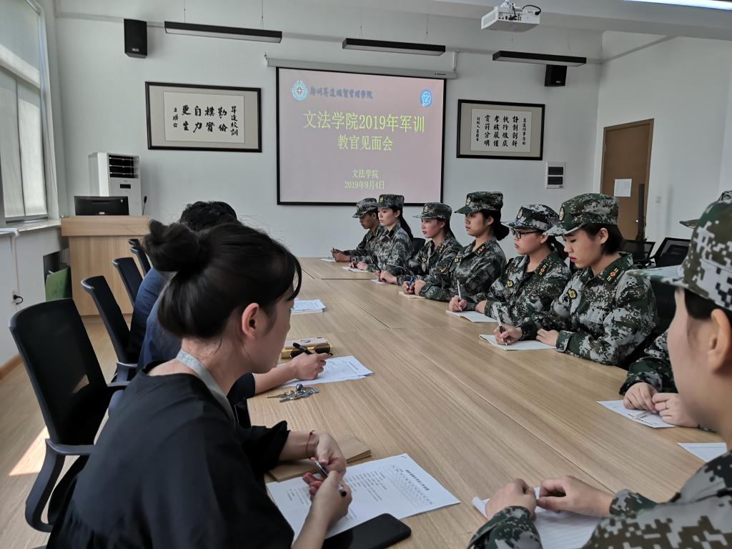 又是一年开学季,又是一年军训时。为了进一步落实好2019级新生军训工作,顺利出色的完成2019级新生军训。2019年9月4日上午,365VIP英国上市官网在教学一号楼会议室召开新生教官团见面会。365VIP英国上市官网经理段丰乐,党总支书记杨明志,团委书记、行政秘书兼军训教官团负责人郑玲玲老师,教官团指导员张喜超老师,2019级新生辅导员刘瑜老师、朱容瑱老师和全体军训教官参加会议。