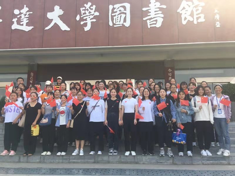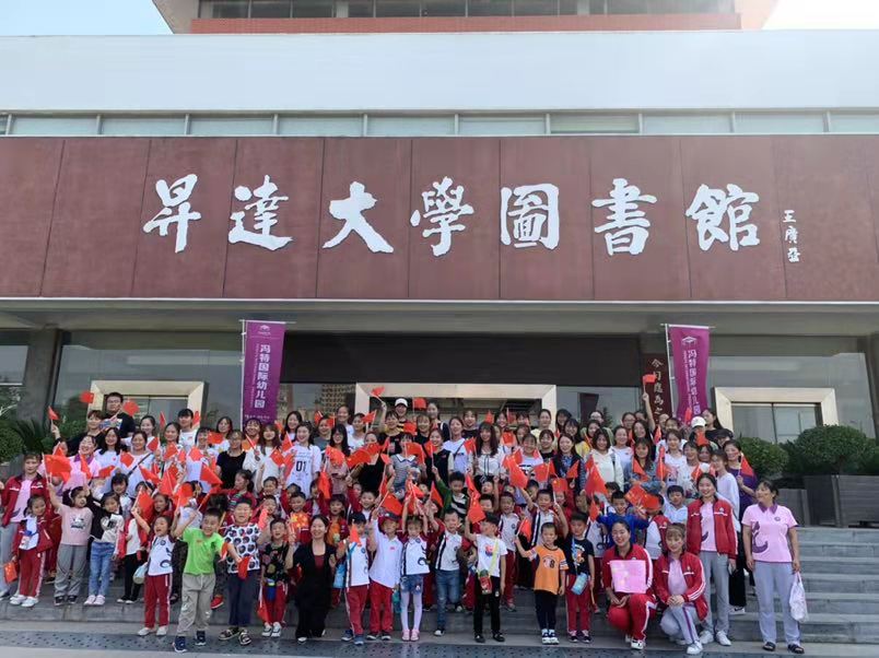2019年9月29日上午9点,18级学前教育专业的员工在图书馆门口集合等待冯特幼儿园小朋友们的到来。