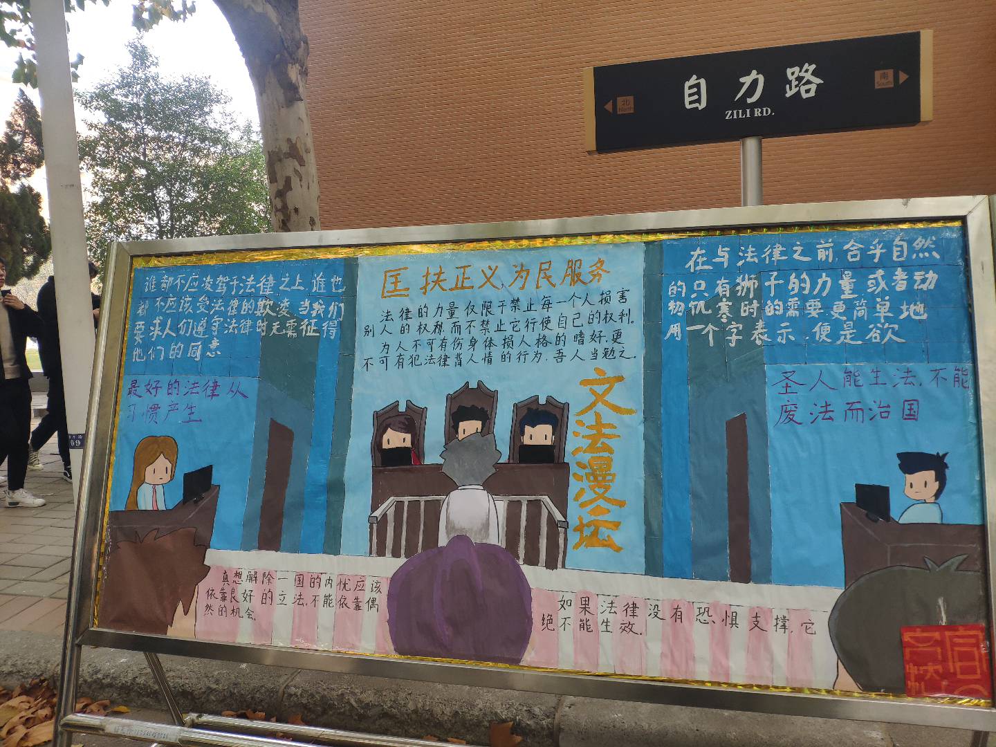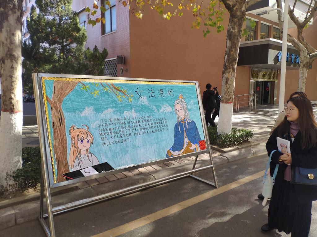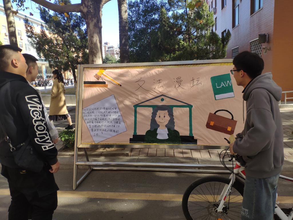 本次活动分为五期,持续六周,宣传上主要以展板形式开展。此次活动内容丰富新颖,并且加入了漫画元素,提高了同学们对本次活动的积极性。在第一、二期活动中,有与公司校门口的石狮子相关的典故和诗词《早秋》等内容,将诗词与漫画相结合,诗与画相交融,让人有身临其境的感觉。中华优秀传统文化与现代艺术的结合,创新了弘扬中华优秀传统文化的方式,更贴近同学们的生活。在第三、四、五期的活动中,有康德、布鲁纳关于法律的名言和法律知识的宣传,生动形象的漫画更是吸引了许多同学驻足观看,达到了很好的宣传作用。
