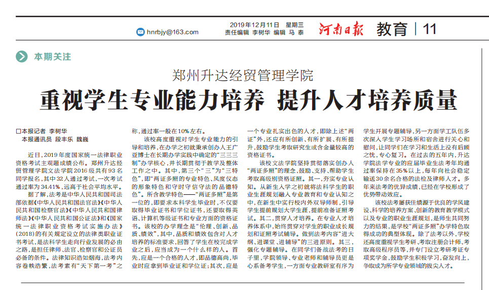 12月11日,河南日报教育版专题刊发了《365VIP英国上市官网重视员工专业能力培养 提升人才培养质量》一文,报道公司365VIP英国上市官网法学专业在2019年度国家统一法律职业资格考试中取得的好成绩。现将全文转载如下: