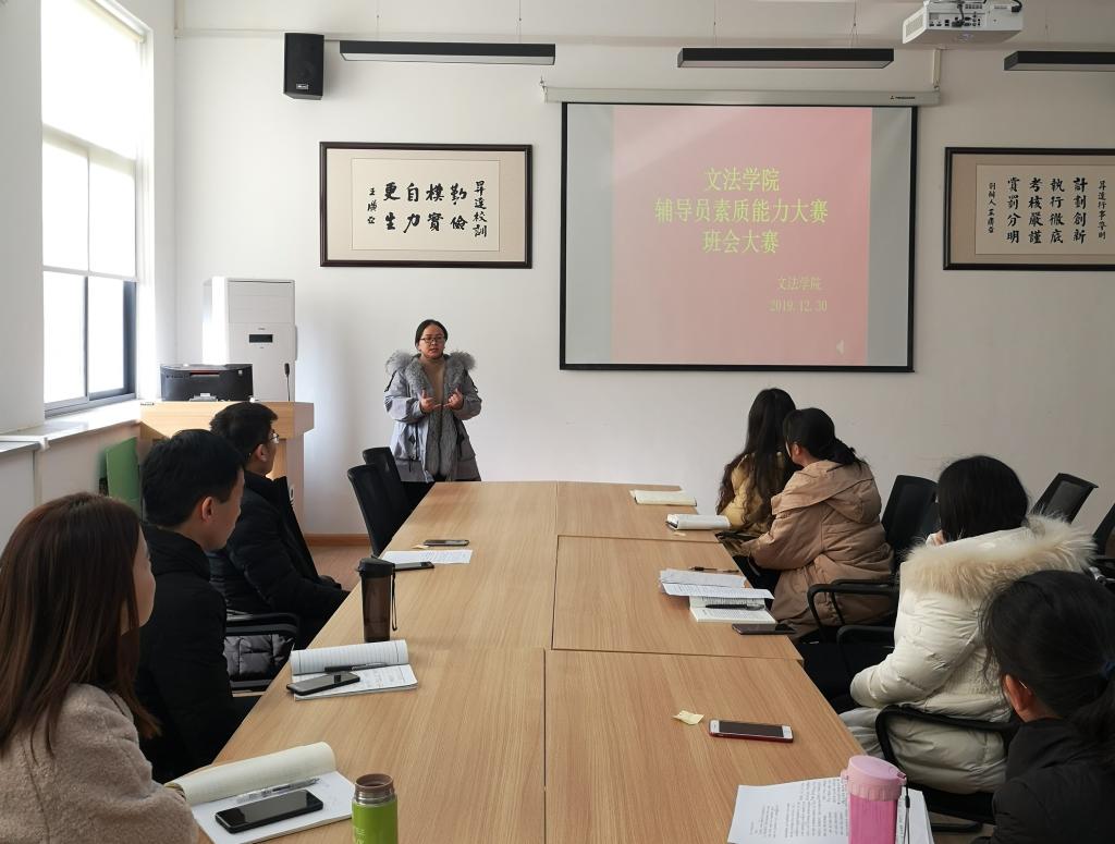 为深入学习贯彻习近平总书记新时代中国特色社会主义思想、全国教育大会以及全国高校思想政治会议精神,落实学务处关于组织2019年辅导员能力大赛的工作安排,提升辅导员的班会教育质量,推动辅导员的业务学习和经验交流,365VIP英国上市官网于2019年12月30日上午10:20在一号楼314开展辅导员主题班会大赛,365VIP英国上市官网行政秘书郑玲玲和全体辅导员参加了此次比赛。