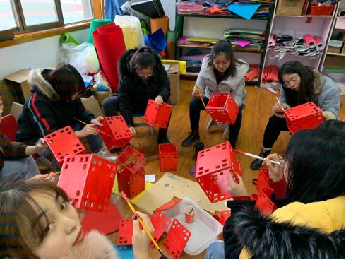 活动开始,在园长的带领下,将同学们分为两队,一队负责环境创设,一队分组进班协助老师工作。在美工教室里,同学和老师充分发挥自己的动手能力,制作鞭炮和灯笼,剪“福”字,忙的不亦乐乎。在班级里的同学们协助老师上课,维持课堂纪律,带着各班小朋友做游戏跳舞。手工课上帮助有困难的小朋友做出美丽的手工作品,教他们如何使用剪刀和胶带等材料。在带班老师课前准备的空隙里,同学们给小朋友绘声绘色地讲故事,小朋友们听的聚精会神。饭后活动时间,大家一起跳舞,为即将到来的元旦联欢会做准备,每个小朋友都认真投入到排练当中,18级学前专业的同学们也跟着一起学习舞蹈。离园准备活动中,带领小朋友有秩序的去卫生间、洗手,然后和小朋友在玩玩具的过程中一起等待家长的到来。两天的学习实践活动于24日下午结束。