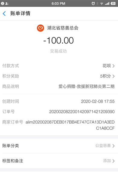 得知武汉物资紧缺,许豫龙同学又通过支付宝向湖北省慈善总会捐款一百元,身未到,心已至。在面对同是执勤人员的父亲,许豫龙同学说:“打虎亲兄弟,上阵父子兵,全国上下共同努力,一定可以打赢这场战役!”